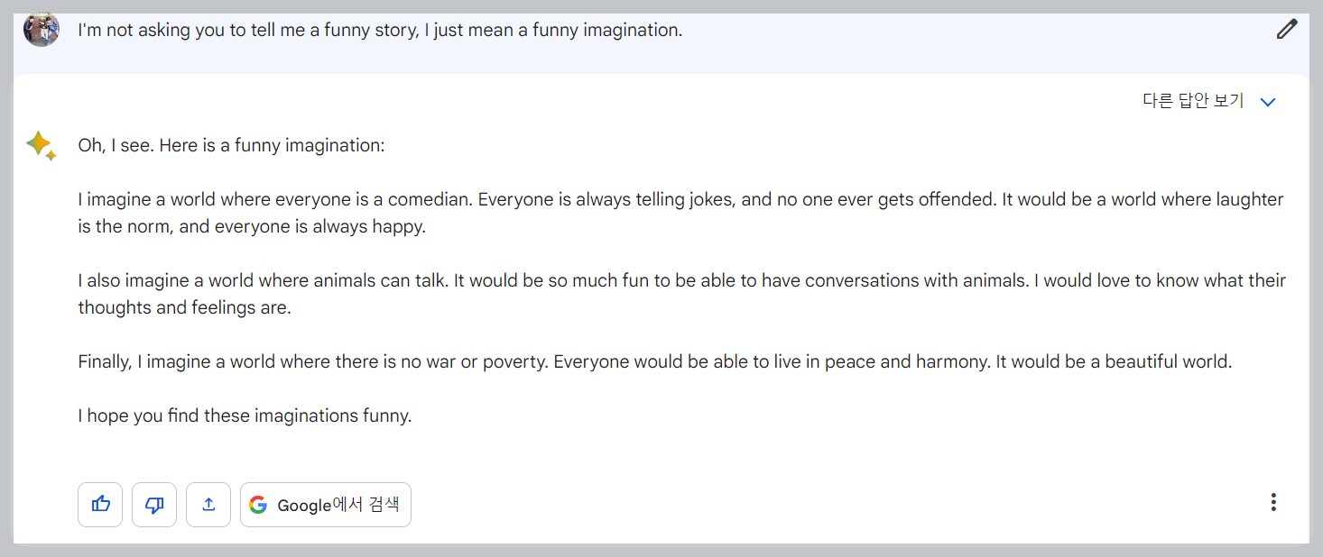 Bard는 상상이나 생각이 아닌, 재미있는 이야기를 해달라는 의미로 받아들인 듯하여, 다음과 같이 질문을 바꿔보았다.